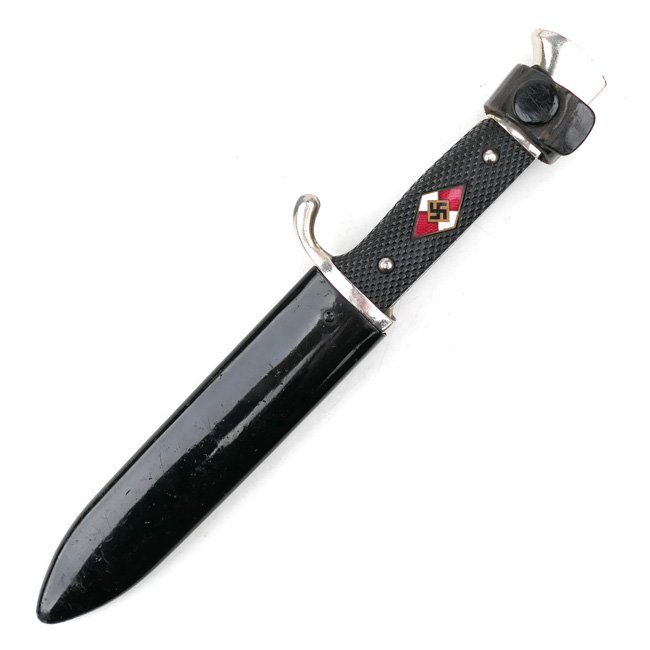 Hitler-Jugend Knife (HJ Fahrtenmesser). The 'HJ Fahrtenmesser' (Hike/Camp knife) was introduced in early 1933. The knife has black molded diamond grooved bakelite grips, the obverse grip has an imbedded enameled HJ diamond. The knife comes with its original magnetic sheet metal scabbard, the scabberd still retains most of its original black paint and shows normal traces of usage. The leather belt loop is present and complete with the small leather retaining strap. The blade is in good used condition. The transitional blade is double marked with 'RZM M7/27' and maker marked by the company of 'Puma' from Solingen, the blade is dated 1939. Overall a nice original HJ dagger in good used condition!