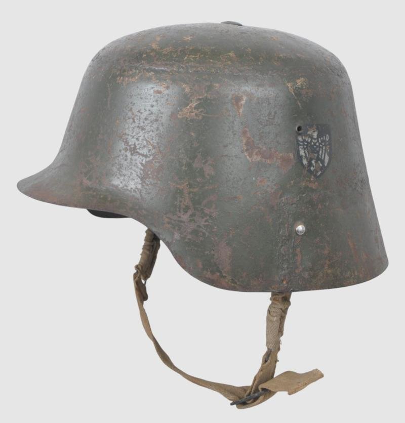 The only one I have ever seen for sale this is the rare early WW2 British made representation of the German helmet used by the British Army for instructional purposes in training films / enemy identification demonstrations etc.Very crude in its construction it is of heavy steel welded together to make the 'coalscuttle' type shape with decals handpainted on either side representative of the national tricolour shield & eagle /swastika emblem. Overpainted in dark green it has a first issue 1939 dated oval dome padded liner system to interior with web chinstrap. Having been shed stored for many years it has some splashes of white paint to the interior which we have made no attempt to remove.