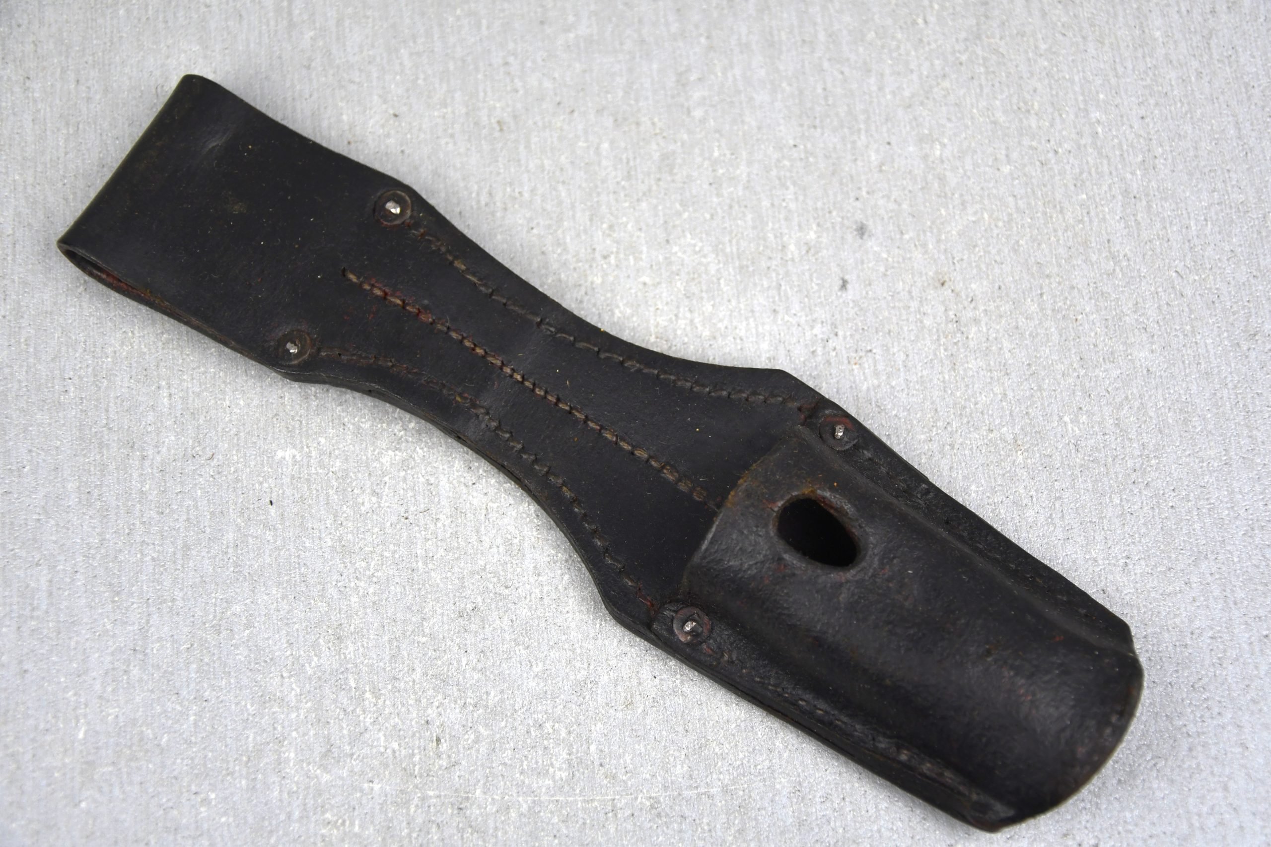 Very appealing solid K98 bayonet frog in leather. Complete with all four steel rivets present. Maker markes faded. Construction ca. 1941