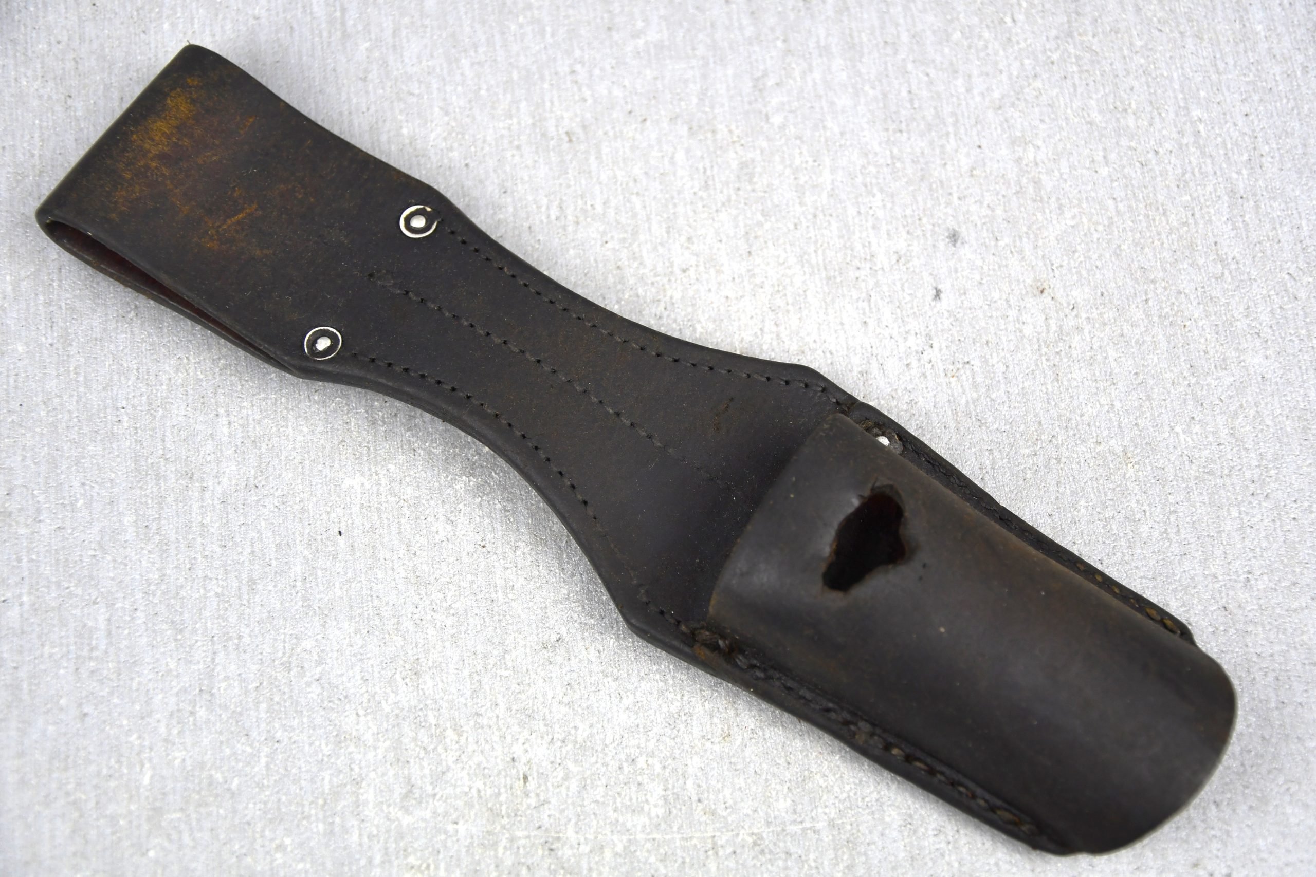 Very appealing solid K98 bayonet frog in leather. Aluminum rivets, one missing. Maker marked and dated 1936.