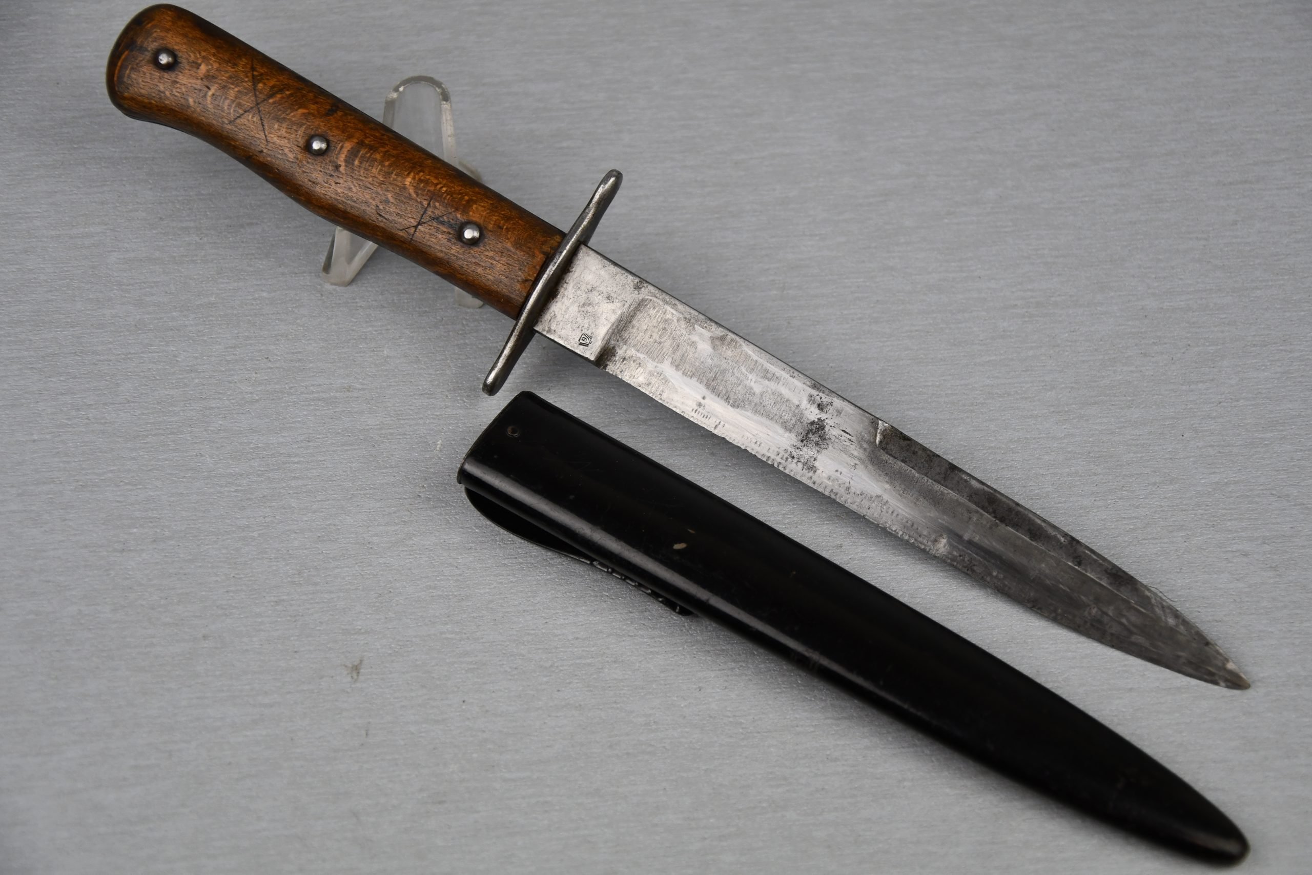 Well preserved and light worn Wehrmacht (Luftwaffe) close combat boot knife in very good condition. Scabbard retains its original black finish and the spring clip is fully functional. The wooden grip shows minimal use and so does the blade. The blade shows no maker mark, as it should be, just a Luftwaffe-style Waffenamt acceptance stamp.. Honest and textbook piece!SHIPPING ONLY TO MAINLAND EUROPE ONLY!