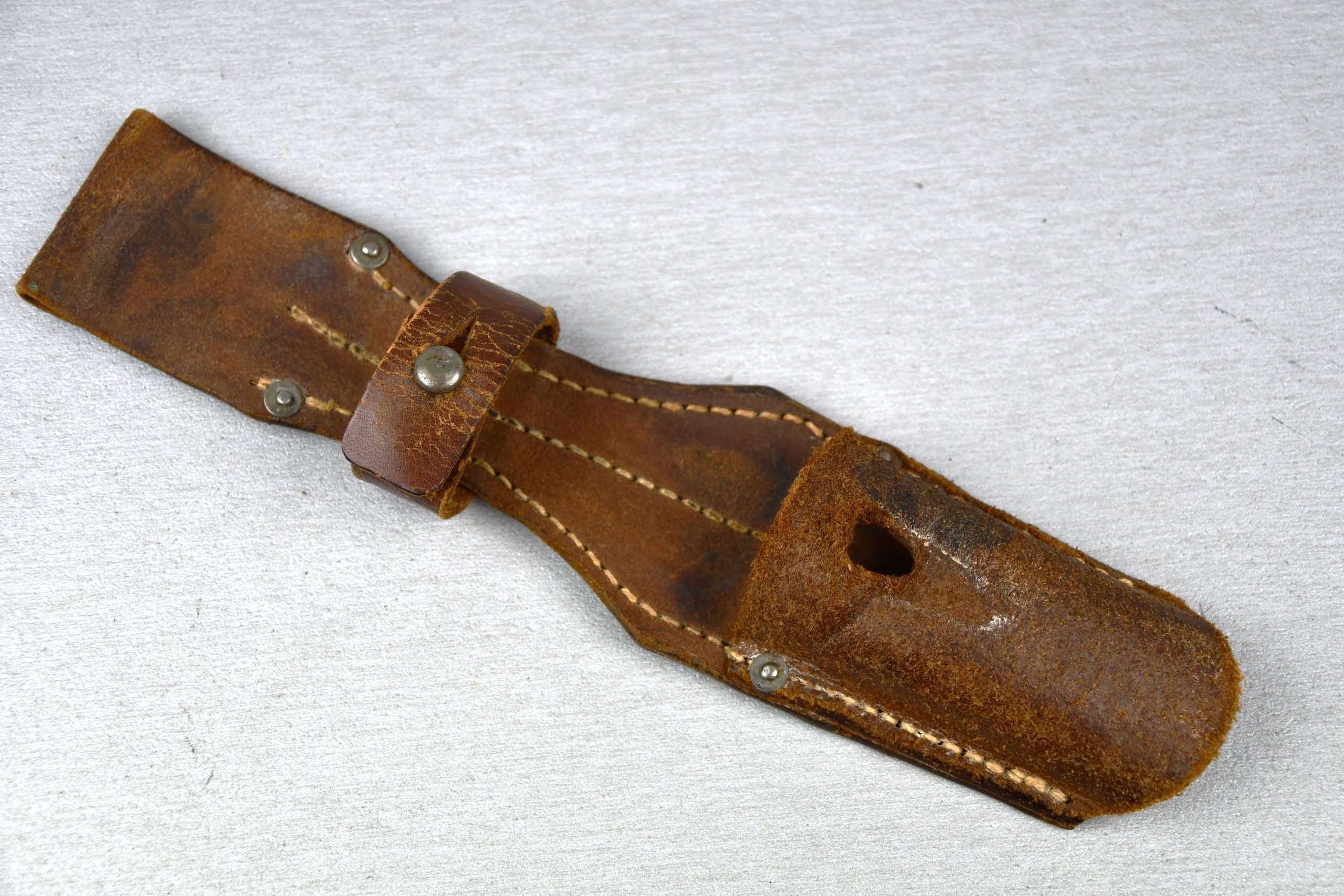 Well preserved late-war constructed K98 bayonet frog in good condition. Maker marked with RBNr. on the upper back; 0/0656/0013? Leather is supple and strong.