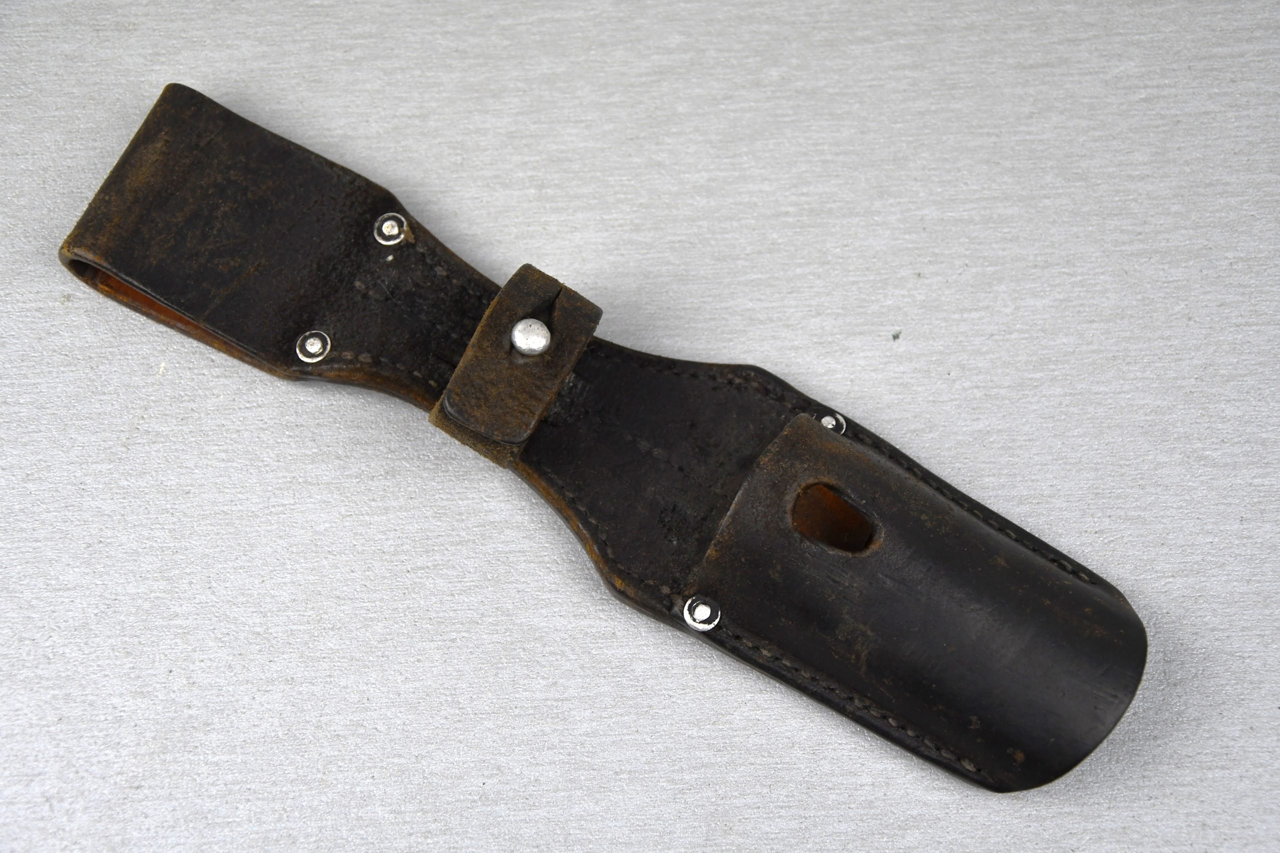 Very appealing solid K98 bayonet frog in leather. Complete with four aluminum rivets. Maker mark by Reinhold Adam dated 1937