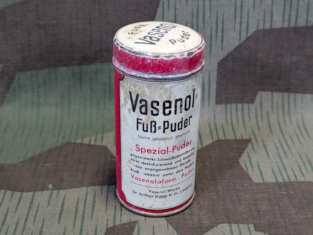 Original pre-war or wartime era Vasenol foot powder container. It is in decent condition with wear and age there are some minor dents. It is about half full, so there is still original foot powder inside. Powders like this were popular and widely used within the Wehrmacht.There is an ad for this from the August 1940 issue ofDie Wehrmachtmagazine.These are fairly rare as they were often used up after the war. This is another one of the widely recognized brand names within the collecting and reenacting communities. A very nice display item (although it could get messy if you aren't careful).
