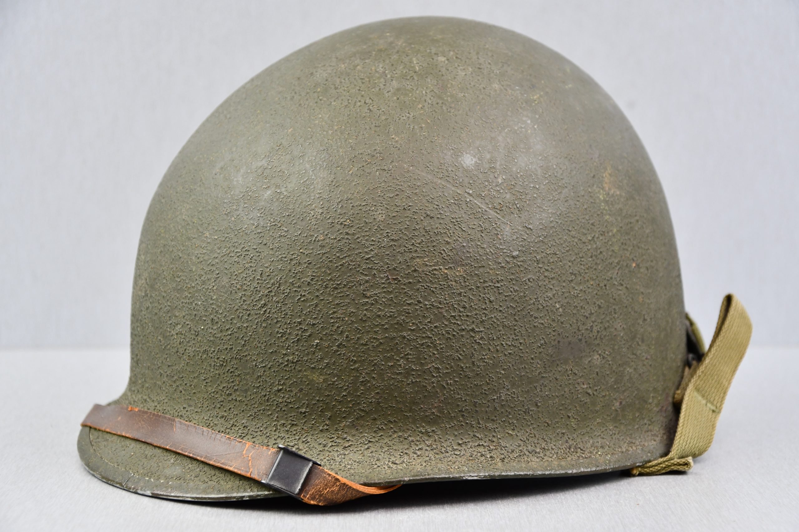 US M1 helmet in excellent, light worn condition. Front seam shows round welds, which would be a Schleuter made helmet. Complete with straps and intact rough green paint. Stamped inside with 163A β S (= Schleuter), I deem! Liner remains in matching good condition and is complete with its chin strap. Maker marked with the firm logo of Firestone. Leather sweatband is a post-war replaced example. Beautiful lid, hard to upgrade!