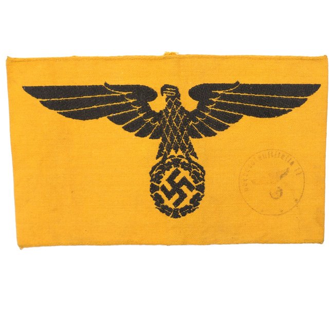 This is a nice golden-yellow coloured, linnen-based armband, as worn by official- and designated employees working in the state's service (Armbinde für Zivilangestellte). The armband shows an interwoven black-coloured (left facing) eagle on a yellow background and is executed in a technique similar to the 'BeVo'- weave technique. There is a nice ink-marking which looks to be marked 'Heeresdienststelle 11'. Nice original example in very good condition!