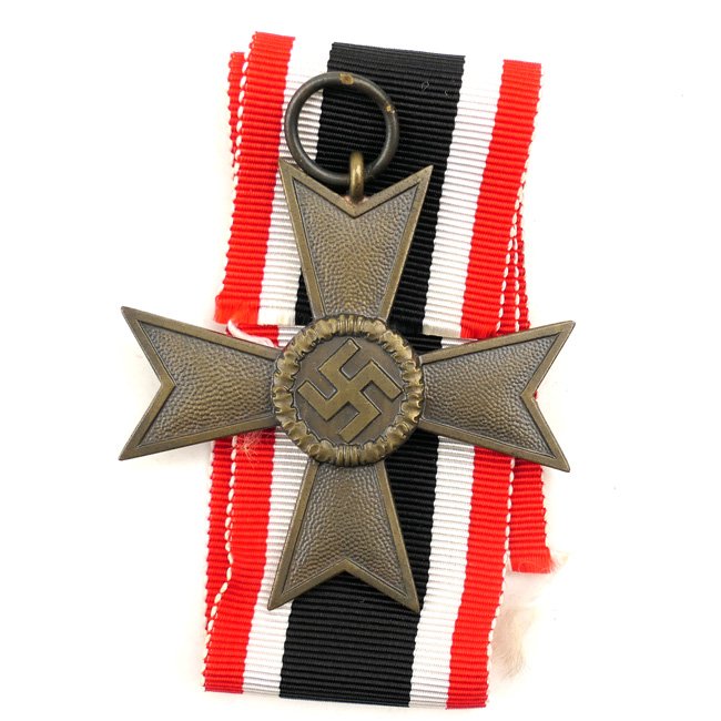 War Merit Cross 2nd Class without Swords (Kriegsverdienst Kreuz 2. Klasse ohne Schwerter). The War Merit Cross was instituted by Adolf Hitler on 18 October 1939 in two classes with both classes issued, with and without swords, for award to military personnel and civilians. The cross is not visible maker marked but can be attributed to production by the company of 'Deschler & Sohn' from München. The cross comes with its original 24cms long sized ribbon. Nice original cross in very good condition!