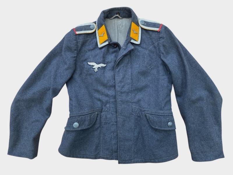 A beautiful Luftwaffe fliegerbluse in very good condition!The fliegerbluse has all its originally sewn buttons and insignia and comes in the rank of Unteroffizier/Oberjäger.It is nicely marked with a factory stamp that is still mostly visible.The shoulder boards feature a red piping loop, identifying the wearer as an Offiziersanwärter (Officer Candidate) within the Luftwaffe.Branch color yellow indicates service in the Fliegertruppe — flying or flight-related personnel.