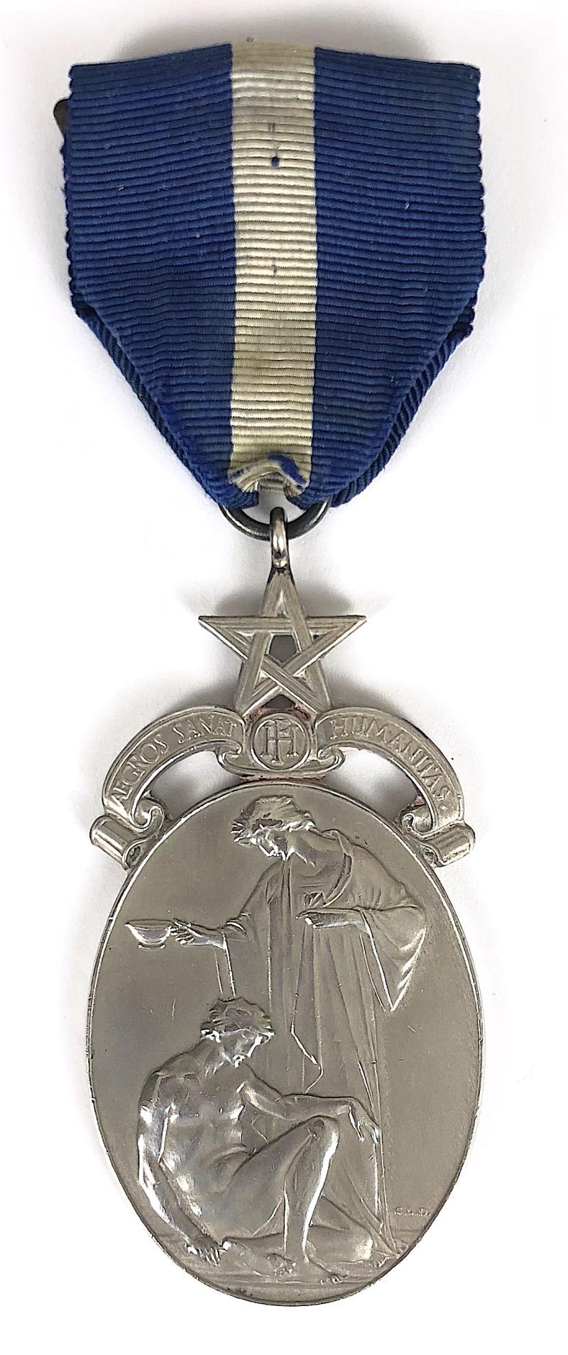 A scarce original circa 1930's period 'Royal Masonic Freemasons Hospital medal', designed by C.L.J. Doman, it shows the symbolic figure of humanity succouring the sick, surmounted by the five pointed Masonic star with motto below 'Aegros Sanat Humanitas' (Kindness Heals the Sick) and interlaced letters 'FH' (Freemasons Hospital); the reverse impressed with London silver hallmarks for 1934, maker's details 'R.J' (Sir Robert Arthur Johnson, Deputy Master and Comptroller of the Royal Mint from 1922 to 1938) and inscribed 'BRO.T.A. ROBSON. No.299'. Very good condition, complete with original blue silk ribbon with pin fittings.Height approx 112mm.