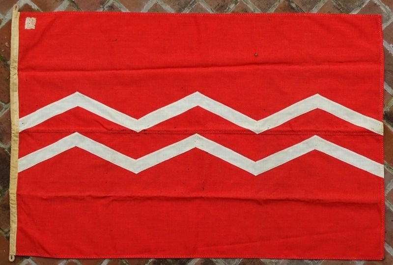 Uncommon WWII Imperial Japanese Harbor Guard Ship Flag. Double sided, hand stitched multi-piece wool construction with white canvas heading and braided rope. There is a paper issue tag on one corner. Measures 34 X 52-1/4 inches, colors are bright, shows a number of small holes.
