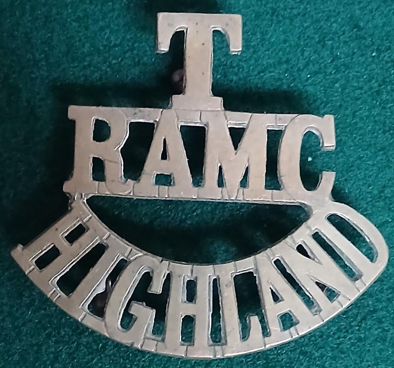 .Brass shoulder title, ' T / RAMC / Highland.'.Worn by Territorial R.A.M.C. units of the Highland Mounted Brigade Field Ambulances.Westlake. 416