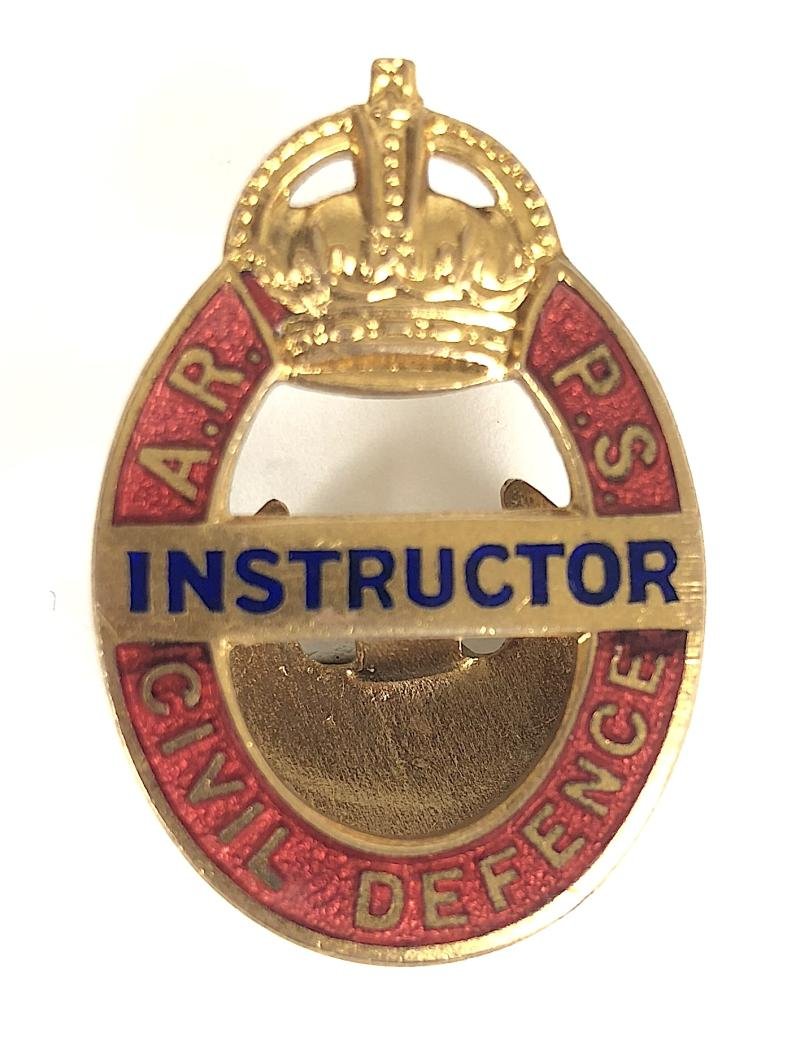 A good original Second World War period 'A.R.P.S. Civil Defence Instructor gilt and enamel lapel badge', the reverse impressed with maker's details 'H.W.M.Ltd' (H.W.Miller Ltd). Very good condition, complete with original buttonhole lapel fitting, no damage to the enamel, gilt finish remains bright, an excellent example.Height approx 33mm.