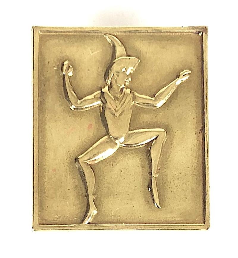 A scarce original Second World War period 'Brownie Guide Promise badge', die-cast brass rectangular shaped example depicting a pixie to the centre, the reverse impressed in relief 'HOLBORN SILVERCRAFT' 'GIRL GUIDES TRADE MARK'. Good condition, retaining original pin fittings, well loved and polished.Size approx 28 x 23mm.