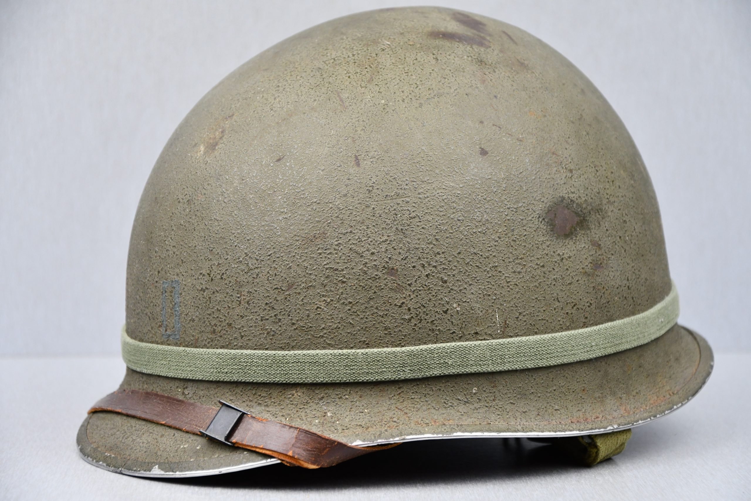A very nice untouched M1 helmet in good, minimal worn, condition. The shell is complete with its chin strap and has a heat number stamped in the interior (hard to read). The curved brim and oval seams are typical for the manufacturer of McCord. The helmet shows minimal wear. Liner is in similar condition and is maker marked by with the firm logo of CAPAC, mid war construction.. The leather sweatband and chin strap present. Subtle Lieutenant bar period painted on the front of the shell. The shell has a camouflage band attached around it, when removing it, it shows a light print so it must have been there for a long time β a nice extra touch!