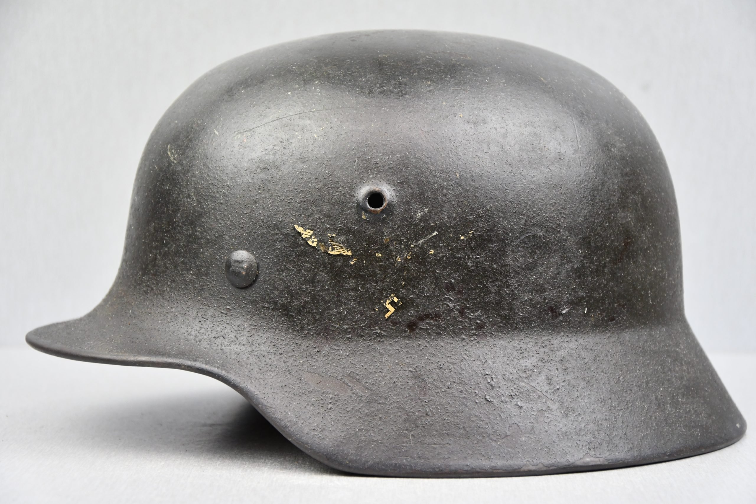 Interesting mid war produced M40 pattern Luftwaffe helmet in good condition. The decal on the left side shows combat wear and only a few parts remain intact. The exterior sand mixed paint is typical for this manufacturer (SE/hkp). The helmet is complete with its original liner. The leather is complete and feels supple and strong. Maker marked by hkp (former SE) and has a size 64 shell. Lot number 976. Nice to see the name tag in the rear rim, and also named in the leather to Unteroffizier Wabersitzki. A great looking single decal Luftwaffe helmet!
