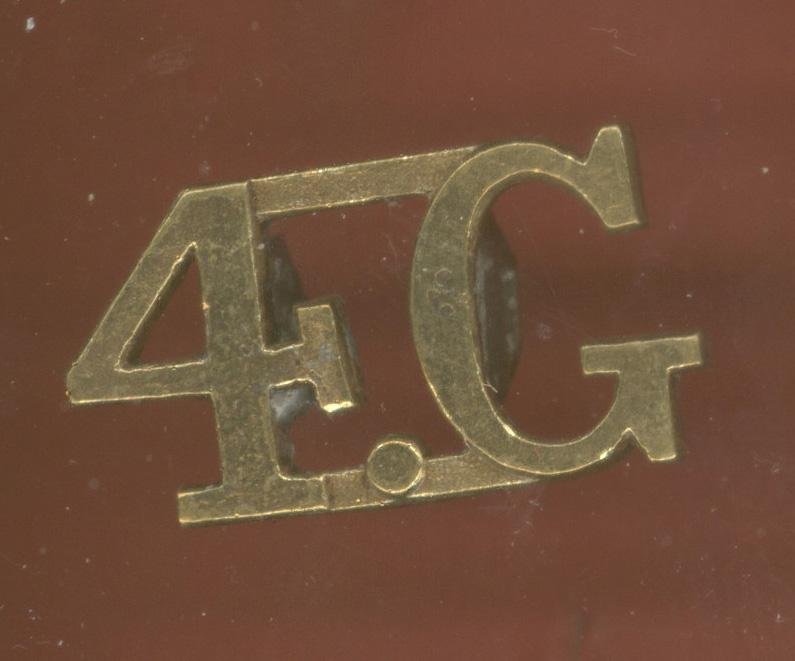 A good early 4.G large pattern blackened brass shoulder title. Two lugs to the reverse . Makers stamp J.R.Gaunt, London. GC...