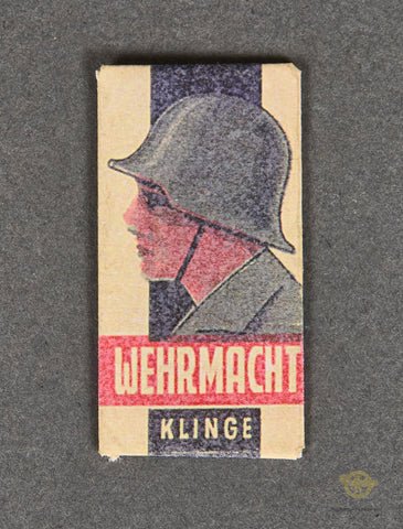 German WWII Razor Blades-We have a packet of razor blades that are beautifully marked. They are marked with Wehrmacht Klinge, and have a great illustration of a Wehrmacht solder in full color. The reverse is marked with a illustration of the razor blade and the words Deutsche Werarbeit. These are excellent.
