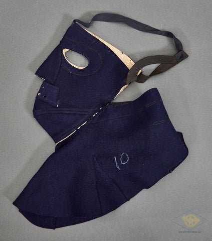 USN WWII Cold Weather Face Mask-This is an super example in excellent condition. This mask is made of a dark navy blue felted wool, with an inside lining of white felt. The white felt inside does have moth damage, there are a few holes. Please see photos. I'm just saying with all this wool this mask must have been itchy as heck. These cold weather masks were issued to US sailors during the war. This has an elastic head harness. The wool material pulls down over the neck and secures with two black buttons. There is a number 10 written on the side of the neck cowl, not sure if this is a size or inventory number. Otherwise, this piece is not marked. Again, other than the moth bites inside, this is in excellent condition. Just a bit of warning, if you put this mask on, and run around your house…you might scare your dog, it's pretty scary looking when worn.