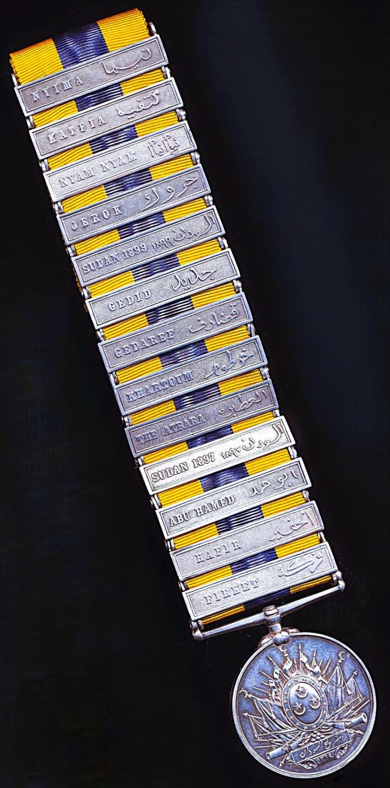 Un-named and un-attributedThe medal fitted with a long length of clean bright, silk moire ribandAn extremely rare multi-clasp medal. All clasps equally riveted, the medal & clasps all equally toned, and a magnificent exampleMedal rolls for the Khedives Sudan Medal awarded to the Egyptian Army, are not in the public domain, and while no one single unit of the Egyptian Army qualified as a unit for more than 12 clasps (the Xth Sudanese Battalion was the only battalion to qualify for 12 x clasps) , it would be possible for a recipient to have earned 13 x clasps by transfer or attached service on the Staff, or with another regiment. Apart from a handful of British Officers, serving on attachment with the Egyptian Army, the overwhelming majority of all multi-clasp (i.e., recipients of 6 or more clasps), were - of course - Egyptian Army personnelAt least one British Officer Major S. K. Flint, O.B.E., Royal Fusiliers, is recorded to have earned and wore the medal with 10 claspsThe first nine clasps represent chronological service during the 'Reconquest of the Sudan' (1896-1899) and latter four clasps are for service in punitive expeditions associated with the 'Pacification of the Sudan' (1900-1908). 'Nyima' was an expedition mounted in 1908, and was the final clasp to be issued with this medalIn total 15 x different clasps were authorised for award with this medal - the only 2 x clasps not represented on this example being 'Bhar-El-Ghazal 1900-02' & 'Talodi'A most impressive multi-clasp medalCondition: EF