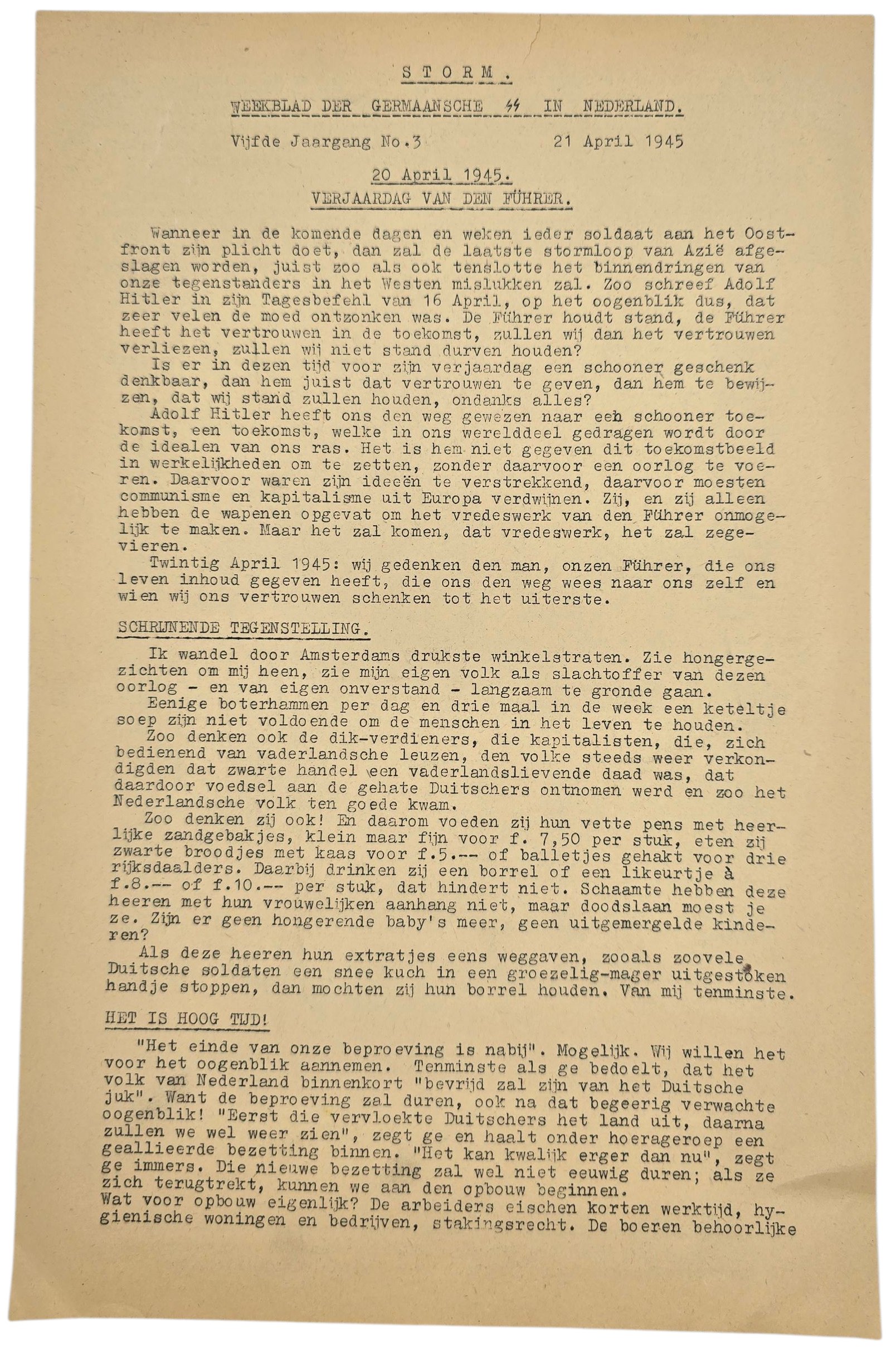 Original WW2 Dutch Waffen SS Newspaper - Storm SS 5th Year No. 3, 21 April (1945)