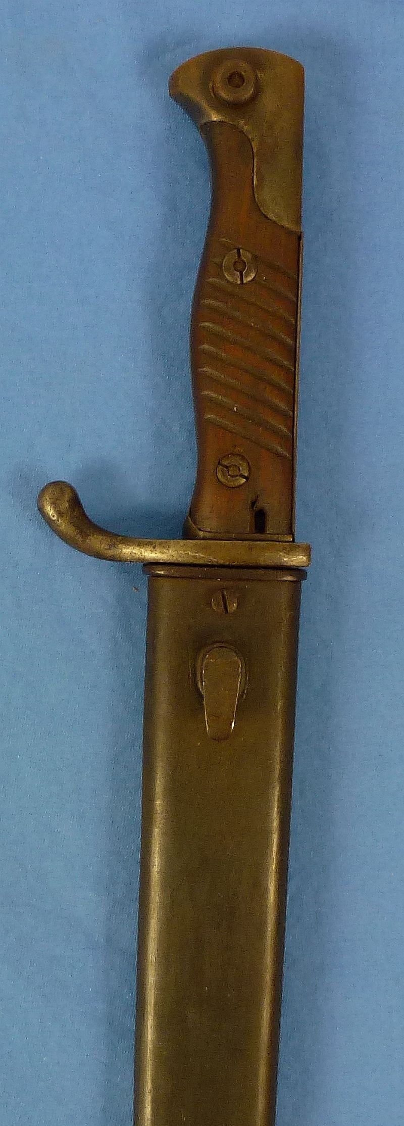 The blade is generally clean, showing spots of old dried oil and surface dirt, but it is without nicks, chips or active rust. Blade has been arsenal reworked removing the saw blade spine. The ricasso bears the firm name of Anker-Werke. The spine has the imperial cypher and it is undated. The bayonet is the model with a flash guard on the grip spine and with the vestigial 'ears' of the muzzle ring. The wood grip plates show age and patina, with pock marks from field use, with a closed vertical crack on one side. The guard and the pommel show age and uncleaned patina. The pommel bears waffen amt marks. The scabbard shows age, but the finish is largely intact. Overall the bayonet is in good field used condition.