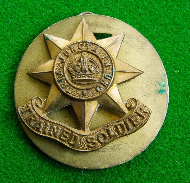 Scarce early pattern king's crown brass sleeve badge with two loops and original shaped brass back-plate to the reverse. The king's crown to the centre of a circlet bearing the motto, ' Tria Juncta In Uno' on an eight-pointed star above the furled scroll, ' Trained Soldier.'