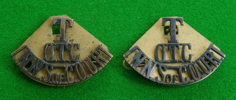 Pair of black-brass shoulder titles complete with original shaped brass back-plates to the reverse, ' T / OTC / Inns of Court '
