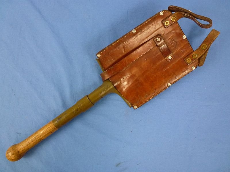 The shovel is in very good condition, with the paint on the shovel blade having wear but being generally intact. The blade is maker marked. The leather cover is similarly maker marked and dated 1940.