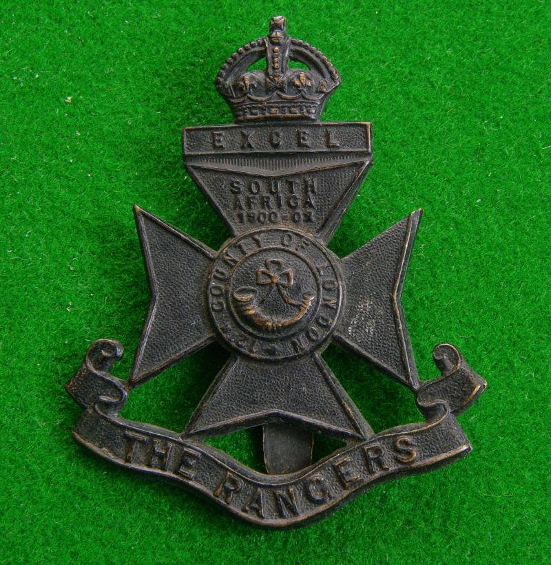 Scarce first pattern black-brass king's crown cap badge with slider fitting to the reverse. A bugle horn to the centre of a circlet bearing the title on a maltese cross carrying the South Africa honour above the furled title scroll, 'The Rangers' surmounted by the crown upon the tablet, ' Excel'