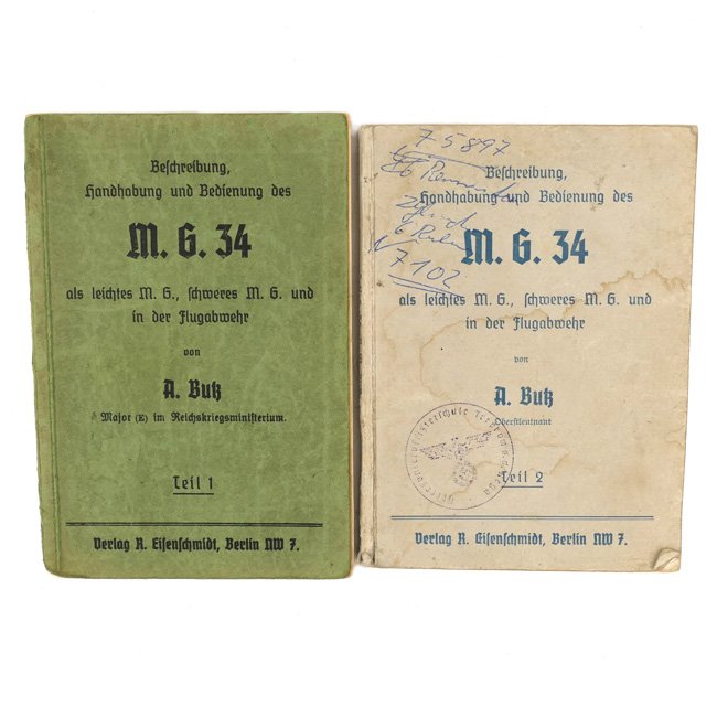 Rare set of MG34 Instruction Manuals (Beschreibung, handhabung und Bedienung des M.G.34). Published by the 'Verlag R. Eisenschmidt' from Berlin in 1938. The booklets are heavily illustrated and showing many black&white photographs. Both booklets are showing clear traces of usage. Rare and hard to find set!