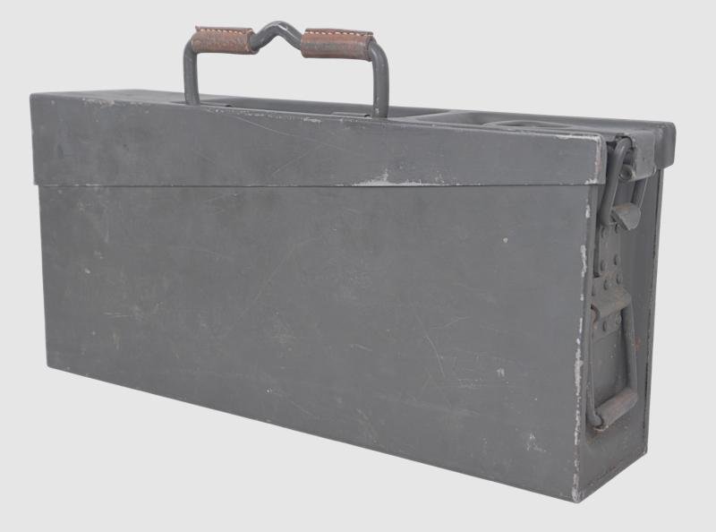 Steel machine gun ammunition tin with a high proportion of its factory grey paint remianing & eagle & swastika marking to lid with date '1943'.Retains all of its leather tabs.