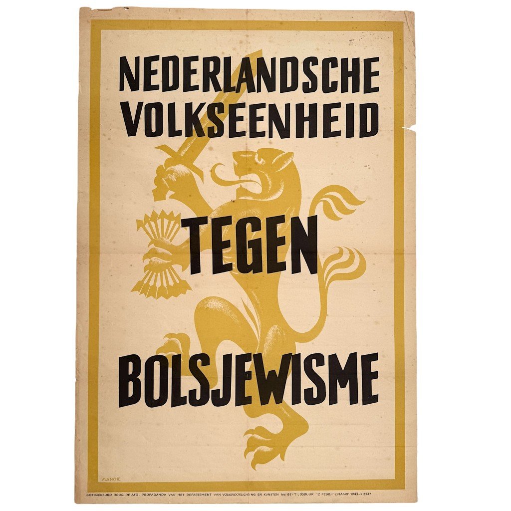 This Dutch NSB poster from the Second World War is a special and rare piece of propaganda from the occupation period.The poster features a large yellow Dutch lion holding a sword and fasces, accompanied by the text 'Dutch National Unity Against Bolshevism.'This print was produced on behalf of the Propaganda Department of the Ministry of Public Information and the Arts, with a printed date of 12 February – 12 March 1943.With dimensions of 80 x 55 cm, it is an impressive historical poster.The poster shows signs of use and age.An interesting used poster for any collection focused on Dutch collaboration and WWII propaganda.Article number: 17064Originele WWII Nederlandse NSB poster 'Nederlandsche Volkseenheid tegen Bolsjewisme'Deze NSB-poster uit de Tweede Wereldoorlog is een bijzondere en zeldzame propagandaposter uit de bezettingsperiode. De poster toont een grote gele Nederlandse leeuw met zwaard en roedenbundel, vergezeld van de tekst 'Nederlandse Volkseenheid Tegen Bolsjewisme'. Dit drukwerk werd vervaardigd in opdracht van de Afdeling Propaganda van het Departement van Volksvoorlichting en Kunsten, met een gedrukte datering van 12 februari – 12 maart 1943. Met een afmeting van 80 x 55 cm is dit een indrukwekkend historische poster. De poster vertoont gebruiks- en ouderdomssporen. Een interessante gebruikte poster voor de Nederlandse collaboratie- en WOII-propagandaverzameling!