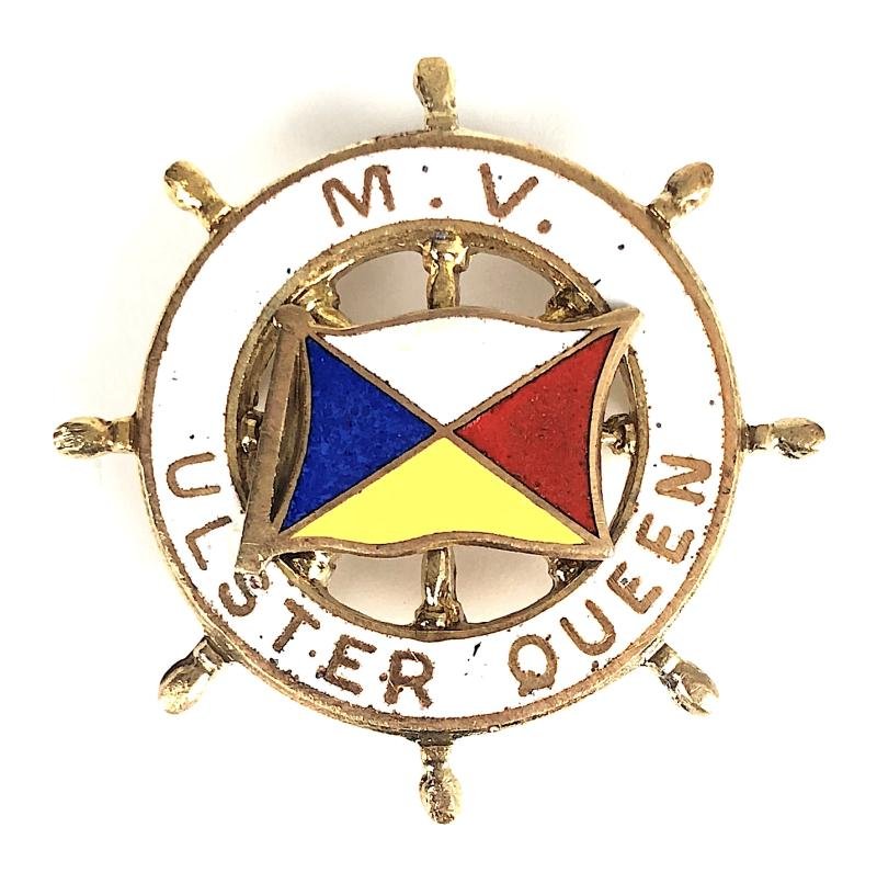 A good original circa 1967 to 1981 period 'M.V. Ulster Queen gilt and enamel souvenir pin brooch' in the form of a white enamel ships wheel the centre mounted with the Peninsular & Oriental Steam Navigation Company house flag to the centre. Good condition, complete with original pin fittings, no stress marks or damage to the enamel, minor manufacturers flaws, gilt finish remains bright.Diameter approx 34mm.