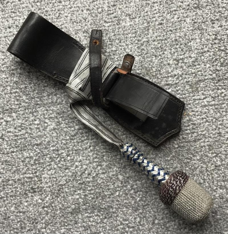 Excellent example of the leather suspension device for the TENO Hewer. These weapons were prevented from moving in the hanger by means of an overly delicate grip strap and 'bobbin' which is rarely found intact due to the weight of this heavy piece ripping through the locating hole in the strap. This example however is complete and in superb condition overall. The metal snap clip has the ' Assmann' makers mark of a stylised 'A' to the reverse. Wrapped about the waist of the hanger is a portepee identified as 'Technical Service NCO'A difficult to find combination in this condition, and a perfect partner for our Hewer listed earlier.Please call to discuss options.