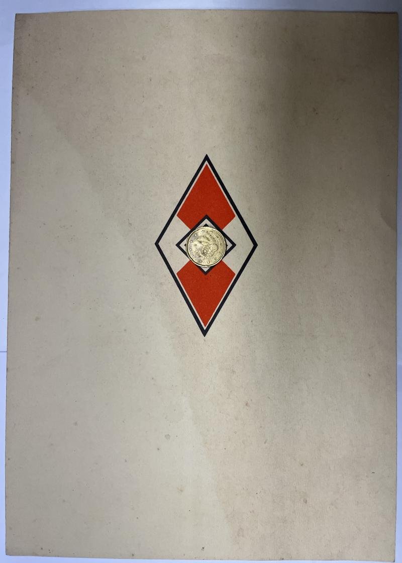 Very attractive A4 size confirmation form/citation which has not been handed-out (though filled in) to ? who entered the 'Hitler-Jugend' on the birthday of Adolf Hitler (20-4-1939).Great special occasion form/citation.