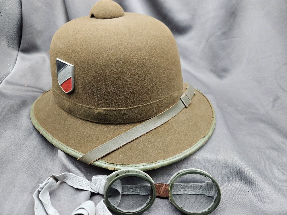 Original WWII German Tropical Helmet. Second pattern felt tropical helmet. In very good condition. Goggles are included. Free shipping in the US. Foreign buyers contact us for a shipping quote. Located in our Portland store.