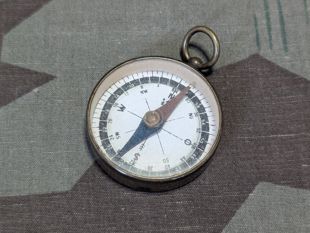 Small German compass made from brass. The design of this is very simple and matches the compasses used in WWI. It does point North. In decent condition.