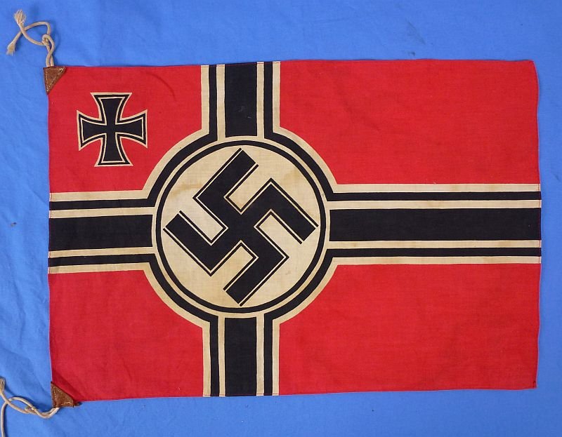 The printed cotton kriegs flag has two reinforced corners which retain cord ties. The flag shows age toning and subtle spots, but it is without holes or damage and it makes an excellent appearance.