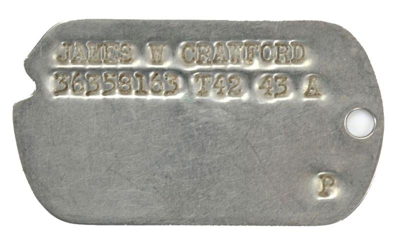 In a very good condition a US WW2 Stainless Steel made Dog-Tag on the name of James W. CrawfordJames was a member of Section E, 2111th Army Air Force Base Unit, BAAF Blytheville Air Force Bas Arkensas.