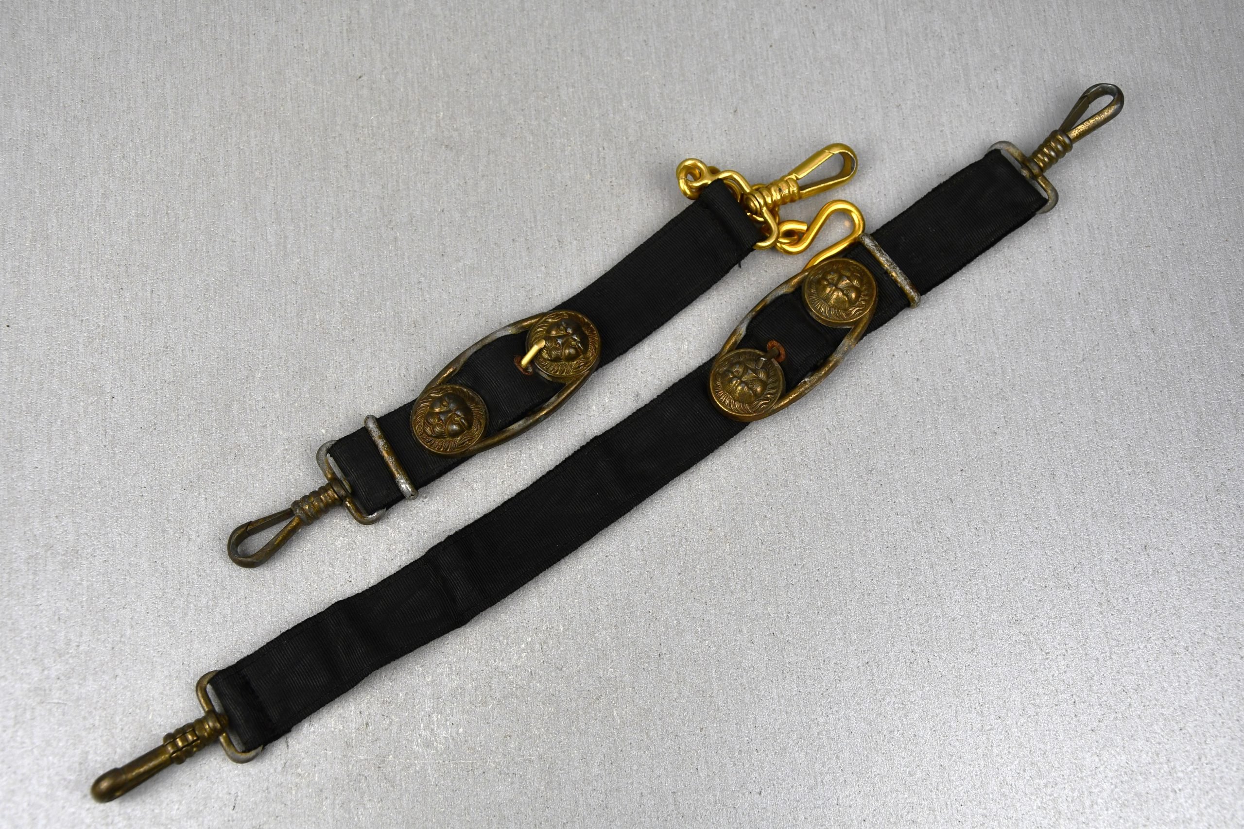 Period pair of Kriegsmarine hangers for the officer dagger. Mainly zinc plated metal pieces, one clip executed in gold aluminum. Looks to be period made like this, I deem.
