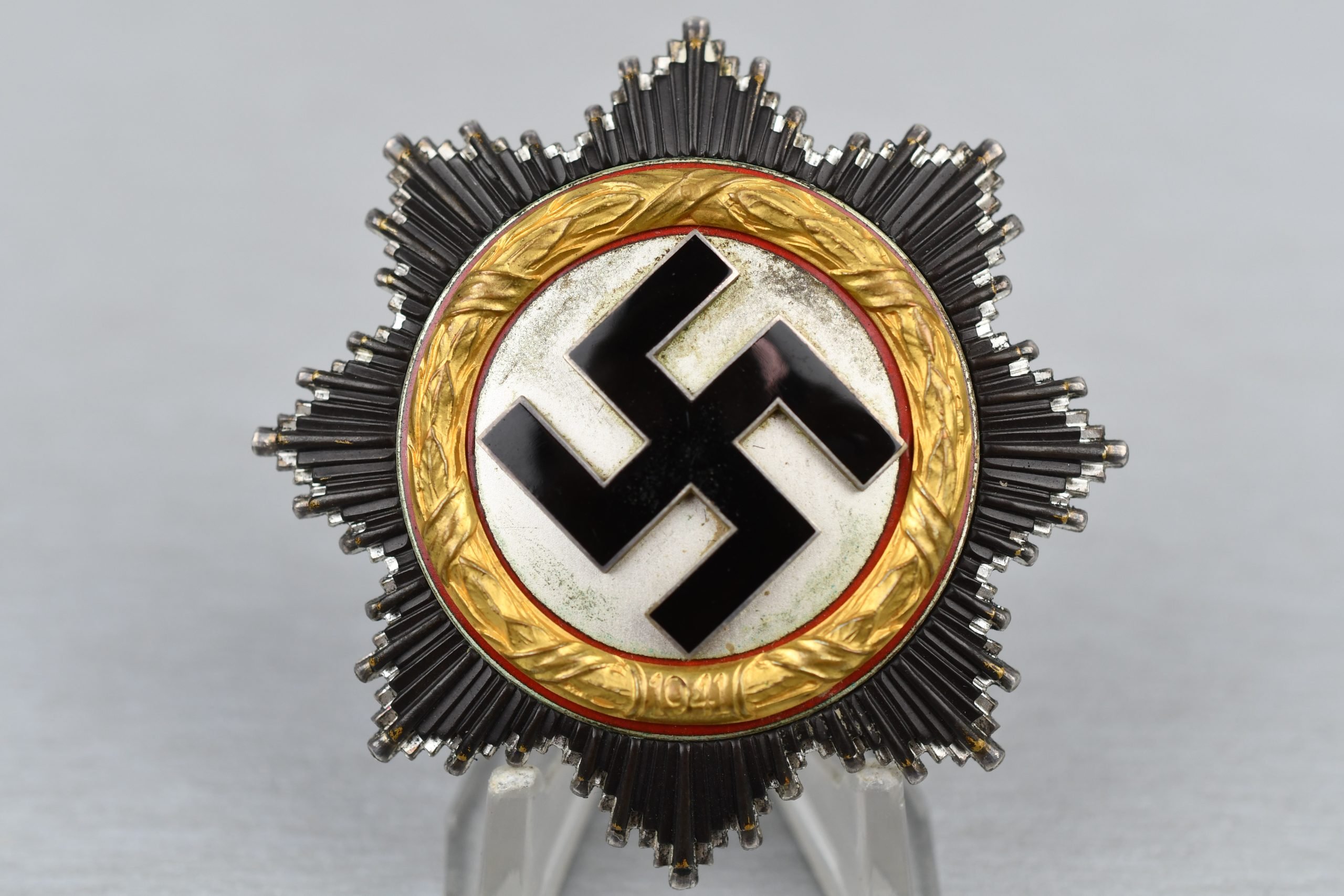 Genuine and iconic German Cross in Gold (Deutsches Kreuz in Gold). Light worn piece with beautiful patina. Maker marked on the reverse of the pin with PKZ number 20 (C.F. Zimmermann – Pforzheim). Enameled surface of the swastika remains in excellent condition and shows no damages. Grey colored wreath shows normal wear and still most of its genuine finish intact. Rivets on the back remain tight and untouched. A beautiful and textbook 'Deutsches Kreuz in Gold'! An investment piece for sure!