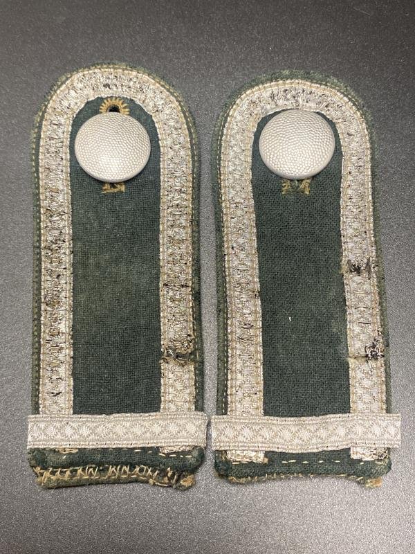 Original pair of shoulder boards as used by a German Army NCO for walking out dress. No piping present on the edges. Original applied silver tresse. Reverse has the tongues to slip on and remove easily.