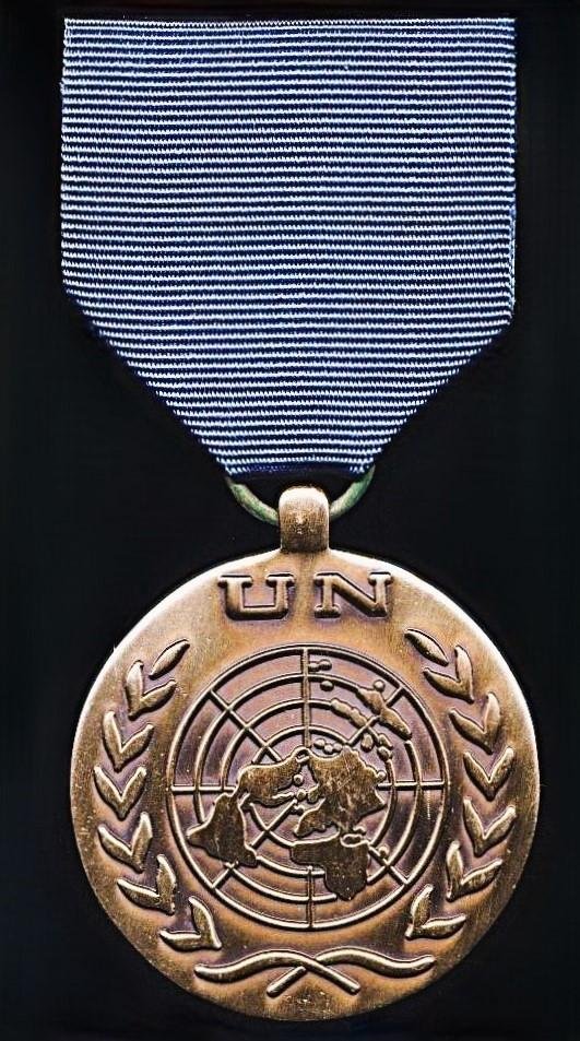 Awarded to qualifying military personnel from member states who have been seconded to UNHQ for 'Staff Duties' (for example planning of new missions) and Logistics for a duration of 90 days or moreThe medal riband fitted with its metal mounting bar, this latter complete with its hinged pin & intricate drop-lock clasp fittings as issuedCondition: EF