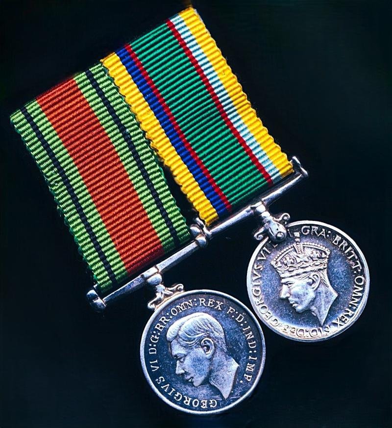 - Defence Medal- Cadet Forces Long Service Medal. GVI issue (Fg. Off. F.B. Dudley. R.A.F.V.R.(T)Frederick Beresford Dudley son of Edgar John Dudley (a Telegraph and Electric Light Assistant Draughtsman & Estimator, with North Staffordshire Railway Company) and Annie Dudley (nee Hilditch) was a native of Stoke-On-Trent, Staffordshire, England, where he was born in 1903. At the time of the compilation of the 1921 National Census for England & Wales, Frederick is recorded employed - like his father - with the North Staffordshire Railway Company, where he is shown employed as an Telegraph and Electric Light Draughtsman and residing with his parents and 2 x younger siblings, viz sister Lily Dudley (b.1908), and brother Edgar Vincent Dudley (b.1916) viz & at the family residence located at Station Road, Endon, Stoke-On-Trent. In 1928, Frederick married Freda Burton at Oakamoor, Staffordshire, England. Almost certainly employed in a reserved occupation for the course of the Second World War, this did not preclude Frederick from volunteering his services for Home Defence, and a role in training cadets for the Royal Air Force, when he obtained a commission as an Acting Pilot Officer in the Royal Air Force Volunteer Reserve (Training Branch) with effect 9 July 1941. His subsequent 'Wartime' promotion to Pilot Officer, was effective from 9 July 1942. Frederick Beresford Dudley, resident of 40 Gallows Hill Lane, Abbots Langley, Hertfordshire, is recorded to have died on 1 August 1960 at St. Pauls Hospital Hempel Hempstead, Hertfordshire, EnglandThe medals are mounted as-worn by the recipient in the swing-style. The silk ribands suspended from white metal mounting bars that each retain their long hinged pin and clasp fittingsFor the recipients fill-size medals see item code 25477 which are being listed for sale separatelyThe sale item here is the 2 x miniatures only. The full-size medals are not include in the sale, and are only here being shown for provenance & illustrative purposes.Condition: About EF