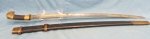 Original era manufacture. Wooden gripped, brass hilted Cossack style sword. The blade measures 32 inches in length with the letter M on one side of the ricasso and a trademark and 1930 date on the other. The blade is clean overall, shows some very light surface corrosion (looks like it would clean away easily)and has not been sharpened or abused. Brass mounted scabbard with a black painted canvas covering over the wooden core.