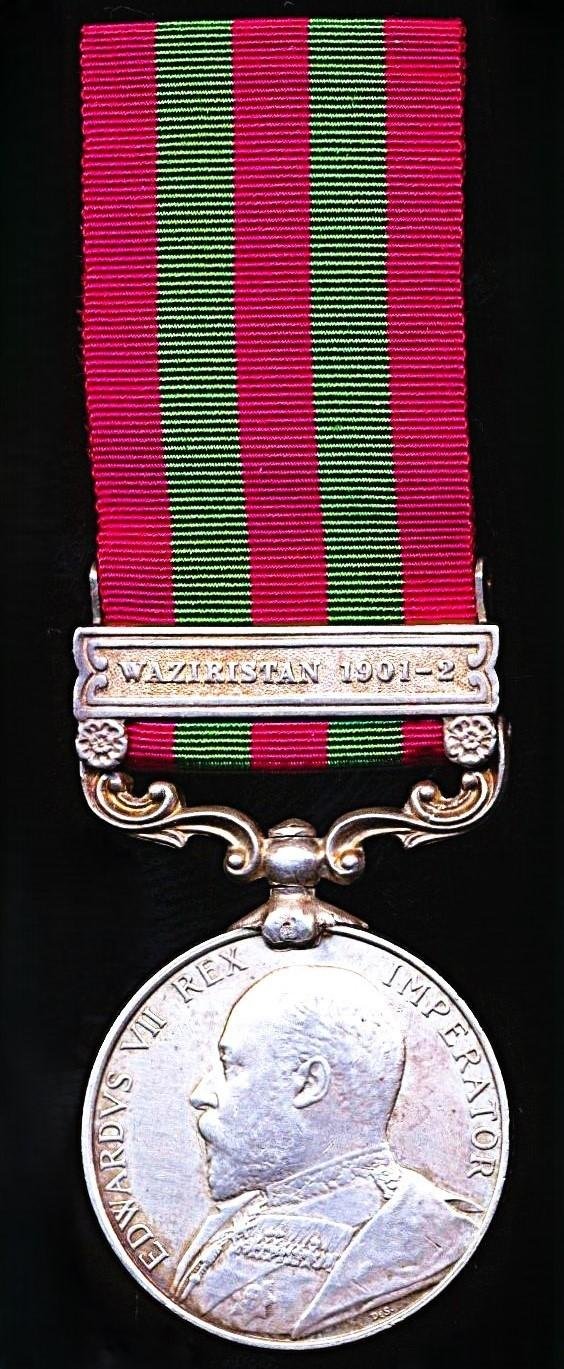 The recipient was an Indian soldier of the Sikh faith holding the rank of Duffadar (Sergeant) with the 5th Punjab Cavalry Regiment of the British Indian ArmyPer the official despatch of Major-General C. C. Egerton dated Abbottabad, 15 March 1902, it is recorded that the 5th Punjab Cavalry were deployed from the very start of the operations during the Waziristan Campaign of 1901-02, while serving with No 4 Column;Quote,No. 4 Column left Wana on the night of the 24th November, and proceeded via the Insar Narai into Khaisara Valley. During this and the three following days this column, aided by a small mixed column detached from the Wana garrison under Captain A.E. McBarnet, 5th Punjab Cavalry, on the 25th and 27th, completely gutted the Khaisara villages. The column returned to Wana on the 28th.Unquote.The regiment suffered 3 x casualties ( 2 x NCO's & 1 x Sowar) all of whom were 'Severely Wounded during the action at Inzar Narai on 24 November 1901Initially raised in 1849 as the 5th Regiment of Punjab Cavalry, the regiment had a long and distinguished record as a constituent unit of the Punjab Frontier Force. The regiment was restyled as 25th Cavalry (Frontier Force) in 1903, and in 1921 amalgamated with the 22nd Cavalry to become the short-lived 22/25th Cavalry, and the following year styled 12th Cavalry (Frontier Force). In 1927 the regiment was restyled Sam Browne's Cavalry (12th Frontier Force)Condition: About GVF