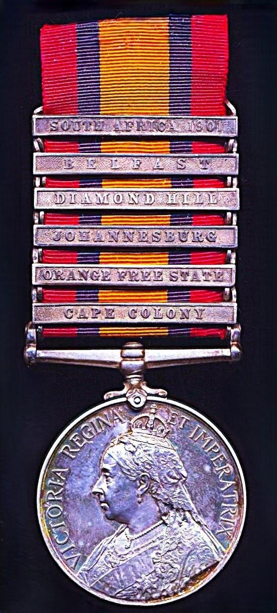 The recipient was an Irishman who served in the South African War with 12th Company Royal EngineersMedal and clasps verification: The medal with all 6 x clasps to Sapper Gallagher, is confirmed as entitled per the respective campaign medal roll of the 12th Company Royal Engineers (ref WO 100/156) that was compiled and signed in South Africa. The latter medal roll entry with remark 'To England 22.06.01'Thomas Joseph Gallagher, son of John Gallagher, was a native of, Dunkerrin, Roscrea, Kings County (now called Offaly), Ireland, where he was born in 1866. By profession a 'Carpenter' he was 24 years and 9 months of age, when he enlisted in the British Army, at, London, England, on, 20 March 1891. Thomas subsequently served a total of 12 years with the British Army, By the time he took his discharge from the British Army on 19 March 1903, most of his service had been spent overseas, including active service during the South African War. His record of service is summarised below:- Home: 20/03/1891 - 26/05/1892- Halifax (Nova Scotia): 27/05/1892 - 07/12/1893- Bermuda: 08/12/1893 - 18/10/1897- Halifax (Nova Scotia): 19/10/1897 - 14/01/1899- Home: 15/01/1899 - 07/11/1899- South Africa: 08/11/1899 - 18/07/1901- Home: 19/07/1901 - 19/03/1903The recipients service paper include the remark that he was a 'Skilled Carpenter'The recipients service papers are extant and accessible at The National ArchivesThe medal with most attractive toning - not having been messed about with for many years!Condition: Toned about EF
