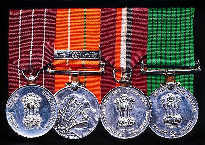 - India: Sangram Medal 1971 (4448985 Sep E&BR Gurmel Ram Sikh LI)- India: Sainya Seva Medal. With clasp 'Jammu Kashmir' (4448985 Sep. G. Ram, Sikh L.I.)- India: Jubilee of Independence Medal 1947-72 (4448985 Sep. EBR. Gurmel Ram Sikh LI)- India: Armed Forces 9 Years Long Service Medal (4448985 Sep, Gurmel Ram, Sikh L.I.)Important:The inclusion of the abbreviation EBR in the naming (shown on 2 x medals) is to reflect that the recipient was a COMBAT INFANTRYMAN (Sepoy) who also held the trained speciality of EQUIPMENT BOOT REPAIRER. A scarce seen specialist trained qualification to an infantrymanThe recipient Gurmel Ram, was an Indian 'Jawan' (soldier) of the Sikh faith who held the rank of Sepoy (Private) while serving with the Sikh Light Infantry Regiment - a multi-battalion single 'Sikh' class regiment of the Indian ArmySikh Light Infantry: The regiment was instituted in 1944, at which time it was bestowed the traditions and lineage of the predecessor 23rd, 32nd and 34th Royal Sikh Pioneers of the British Indian Army. The regiment recruits from amongst the Sikh community of Himachal Pradesh, Punjab and Haryana states of India. The regimental motto is 'Deg Tegh Fateh', meaning 'prosperity in peace and victory in war'. The motto has great significance with the tenth Sikh guru, Guru Gobind Singh, with whom the Mazhabi community is very closely associated, Guru Gobind Singh named them Mazhabi as in faithful for their dedication to do good. The regiment's cap badge is a chakram or quoit, with a mounted kirpan. The insignia was designed to honour the Mazhabi community's Akali Nihang ancestryThe medals mounted in the customary Indian Army style, in correct order of precedence, and as-worn by the recipient. The reverse of the mounting pad retaining its medal mounting bar with hinged pin and clasp fittingsCondition: GVF