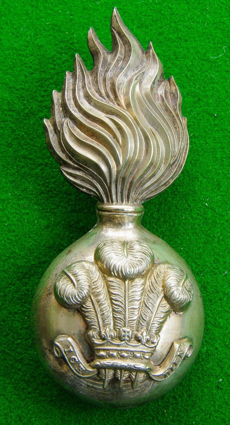 Scarce white metal NCO's large fur cap grenade with two screw bolts to the reverse. The Prince of Wales's plumes mounted upon the ball of a fused grenade.