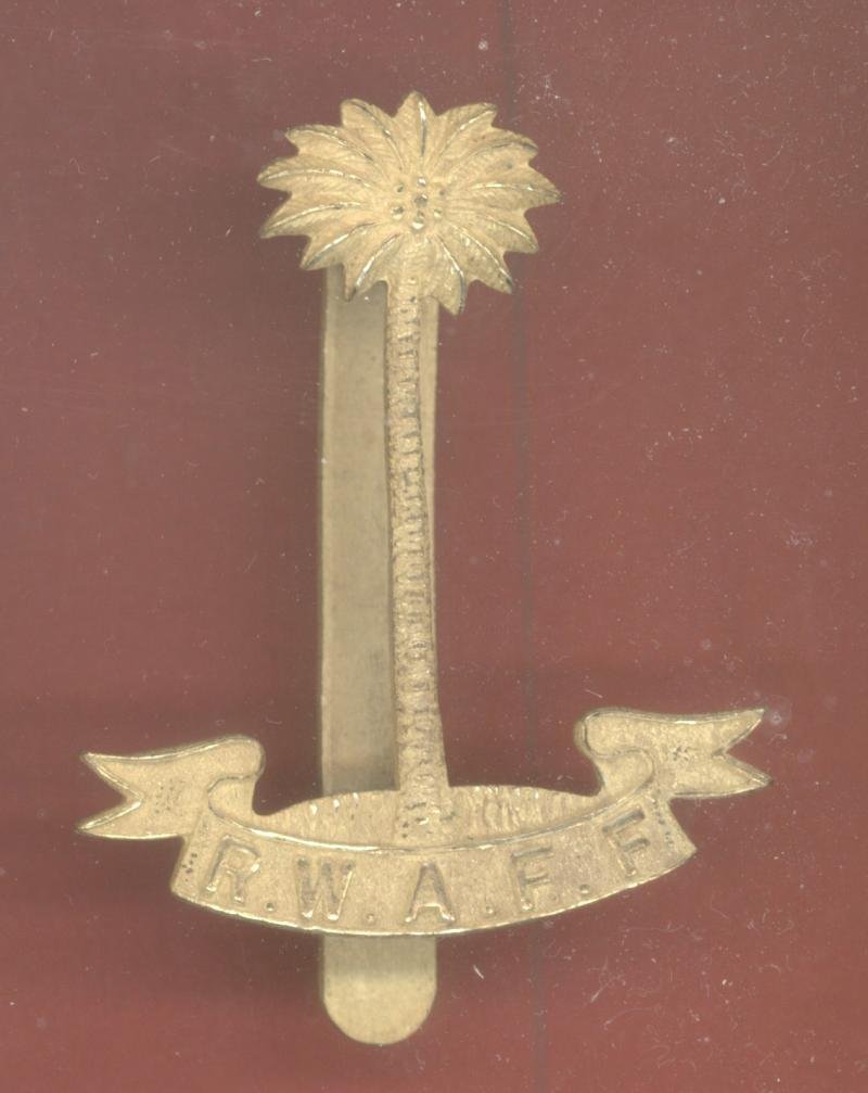 A fine scarce British made die cast fire gilt example worn post 1928. Palm tree on scroll inscribed 'R.W.A.F.F.' . Slider to the reverse. Makers stamp Firmin, London. VGC. As Renfrews 260 but later 'Royal'
